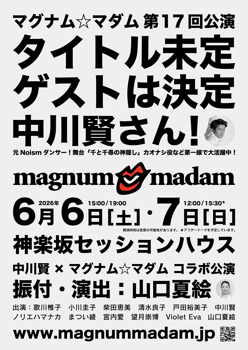 石黒節子、片岡康子率いる、お茶の水女子大学舞踊教育コース卒業。ダンス漬けの学生生活の最中、山崎広太や近藤良平に影響を受け、山口夏絵と出会う。2010年立ち上げよりマグナム☆マダムに参加。心にモチベーション、手には好物の牛肉&ビール、ダンスが教えてくれることは資本主義社会を生き抜く力になると実感しながら、自身のキャリア形成道を爆進中。書類作成業・目ヂカラ担当。